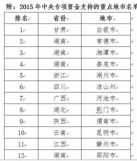 通過初步審查和現場競爭評審,考察了申報區域污染治理的緊迫性、方案的合理性、基礎工作條件、保障措施等,財政部、環境保護部確定對綜合排名前30位的地市(下轄38個重點區域)予以支持。中央資金將連續三年對重點區域進行支持,其中2015年下達資金279315萬元,用于加快推進重金屬污染綜合防治。同時,根據2014年度《規劃》實施考核結果,對存在突出問題的地市,資金安排按一定比例予以扣減。