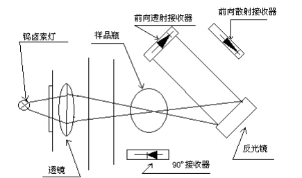 光通過透鏡聚焦后照射到樣品瓶上,一部分信號(hào)由 90o接收器接受,另外分別由前向透射接收器和前向散射接收器接收。