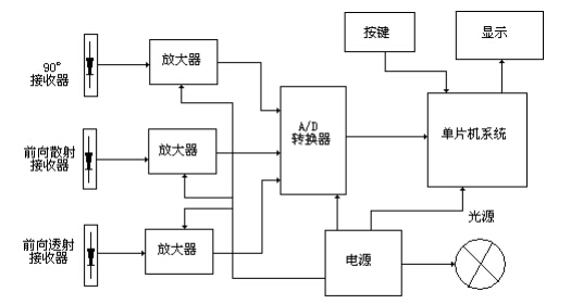 WGZ-2000 型濁度計(jì)的基本原理是當(dāng)光通過裝有懸浮樣品的樣品瓶時(shí),產(chǎn)生的90o散射光信號(hào)與前向透射光和前向散射光信號(hào)的和之比隨濁度大小而變化,即:90o散射信號(hào)/(前向透射+前向散射)信號(hào),儀器的光學(xué)和電路根據(jù)以上原理而設(shè)計(jì)。