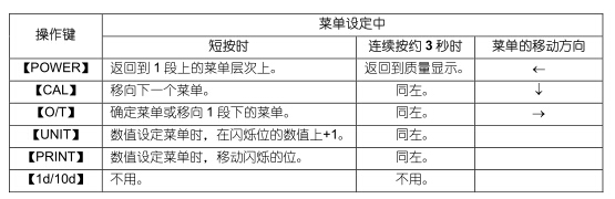 請(qǐng)參照菜單圖(括孤內(nèi)→之后是本文參照項(xiàng)目)(操作說(shuō)明卡片或本說(shuō)明書(shū)的附錄 1)。AUW-D/AUW/AUX/AUY 系列的菜單由 4 個(gè)階層組成,使用頻率高的菜單在第一階層,使用很方便。質(zhì)量顯示時(shí)按 2 次【CAL】鍵,即進(jìn)入菜單。另外,菜單操作中的鍵功能如下表所示。無(wú)論在菜單的哪個(gè)階層,只要連續(xù)按幾次【POWER】鍵,即返回到質(zhì)量顯示。