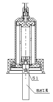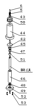b) 滴定管在滴定前,特別是在做不同濃度的滴定,或是在不同溶液的滴定前,必須對(duì)滴定管進(jìn)行清洗。滴定管(4)的裝配示意圖見左圖,在裝配時(shí),在儀器備件中拿出頂桿工具,裝在滴定管裝置下端活塞桿(51)上,如左圖。然后按左圖所示,先拆下螺釘M3×8(3只)(53)、彈簧墊圈(3只)(52)、再拿出下密封環(huán)(49)、下密封圈(48)、滴定管(46)和活塞(47),拆下滴定管(46),用蒸餾水反復(fù)清洗滴定管,清洗完畢,用濾紙吸干滴定管(46)口的水珠。然后按圖示安裝滴定管,先將活塞(47)用頂桿工具從滴定管(46)上口裝入,然后將滴定管(46)和活塞(47)裝入保護(hù)罩(44)內(nèi),滴定管(46)上口應(yīng)與上密封圈(45)緊貼,且不能碰碎滴定管(46),再將下密封圈(48)、下密封環(huán)(49)安裝好,最后用螺釘M3×8(3只)(53)、彈簧墊圈(3只)(52)將滴定管拼緊,注意,在用螺釘M3×8(3只)(53)拼緊時(shí),應(yīng)均勻拼緊,否則滴定管可能漏液,影響滴定精度。然后利用頂桿工具將活塞(47)拉到最低點(diǎn)(如圖示位子)。