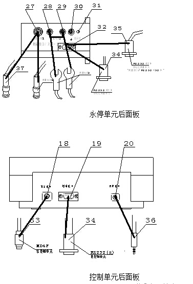 c) 用控制單元―――>永停測(cè)量單元專用連接線(34)將控制單元“測(cè)量接口”(19)和永停測(cè)量單元“測(cè)量接口/RS232”(32)連接起來。