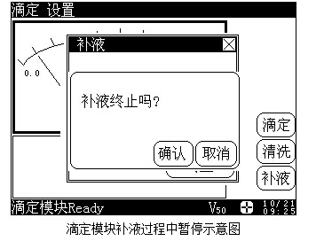滴定開始后,儀器會(huì)自動(dòng)打開攪拌器,以用戶設(shè)定的攪拌速度攪拌10s,同時(shí)滴定模塊會(huì)開始補(bǔ)液,等儀器補(bǔ)液結(jié)束,儀器才開始真正的滴定。儀器會(huì)按照自動(dòng)滴定模式控制整個(gè)滴定過程,用戶不必進(jìn)行過多的干預(yù),儀器會(huì)自動(dòng)添加、自動(dòng)判斷、自動(dòng)采樣、自動(dòng)評(píng)估終點(diǎn),一面添加,一面動(dòng)態(tài)顯示測(cè)量值和滴定數(shù)據(jù),如果儀器發(fā)現(xiàn)終點(diǎn),儀器會(huì)鳴叫3次提示用戶,滴定自動(dòng)終止。在滴定過程中,用戶隨時(shí)可按“終止”鍵來終止滴定。儀器將詢問用戶是否真的終止滴定,顯示“終止滴定嗎?”等字樣,用戶可按實(shí)際需要終止或繼續(xù)滴定下去。如果儀器發(fā)現(xiàn)已添加完用戶所設(shè)定的結(jié)束體積(最大體積),則儀器將自動(dòng)提示用戶,是否繼續(xù),同樣用戶可按實(shí)際需要選擇終止滴定或繼續(xù)滴定。按“確認(rèn)”鍵結(jié)束滴定,按“取消”鍵,繼續(xù)滴定;顯示如下: