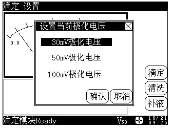 永停滴定需要極化電壓,分別有30mV、50mV、100mV等3種極化電壓,用戶可根據(jù)化學(xué)反應(yīng)的性質(zhì)選擇不同的極化電壓。
