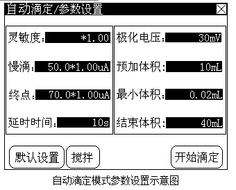 開始自動(dòng)滴定模式之前,需要進(jìn)行一些自動(dòng)滴定模式參數(shù)的設(shè)置,這些參數(shù)包括:靈敏度、極化電壓、慢滴電流參數(shù)、終點(diǎn)電流參數(shù)、延時(shí)時(shí)間參數(shù)、預(yù)加體積參數(shù)、最小體積參數(shù)、結(jié)束體積參數(shù)等。這部分參數(shù)控制著儀器的自動(dòng)滴定模式,修改這部分參數(shù)將直接影響滴定的結(jié)果,絕大多數(shù)情況下,用戶不必設(shè)置這部分參數(shù),即能滿足滴定要求。