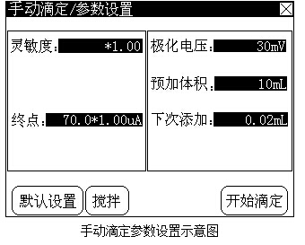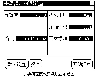 同樣的,手動(dòng)滴定模式有以下這些參數(shù):靈敏度、極化電壓、終點(diǎn)電流參數(shù)、預(yù)加體積參數(shù)、下次添加體積參數(shù)等。