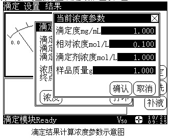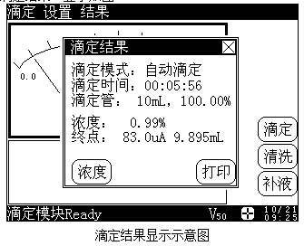 滴定結(jié)束后,如果有終點(diǎn)存在,那么儀器會(huì)自動(dòng)在菜單項(xiàng)上增加“結(jié)果”項(xiàng),用戶可計(jì)算濃度并打印測(cè)量結(jié)果。