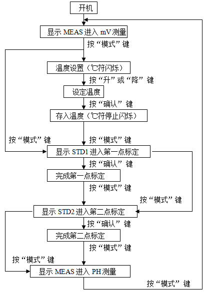 mV測(cè)量(顯示MEAS和 mV) 溫度設(shè)置(顯示℃閃爍) pH標(biāo)定1(顯示STD1) pH標(biāo)定2(顯示STD2) pH測(cè)量(顯示MEAS和 pH);