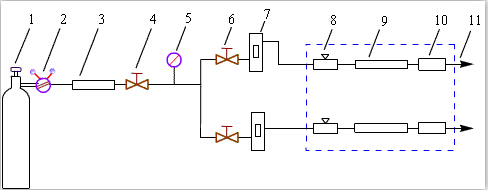 圖中:1—高壓氣瓶(載氣);2—減壓閥(氫氣表或氧氣表);3—凈化器;4—穩壓閥;5—壓力表;6—針閥或穩流閥;7—壓力表;8—汽化室;9—色譜柱;10—檢測器;11—恒溫箱。