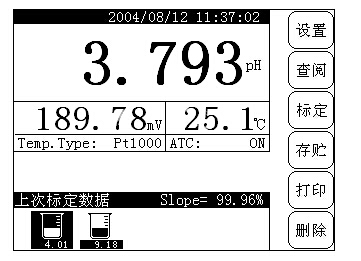 為了方便用戶使用,儀器一開機(jī)即進(jìn)入pH測(cè)量狀態(tài),顯示如圖(1)所示,其中顯示屏上方顯示有當(dāng)前的pH測(cè)量結(jié)果和系統(tǒng)時(shí)間、下方為對(duì)應(yīng)的電位和當(dāng)前溫度值以及溫度電極類型和自動(dòng)溫度補(bǔ)償狀態(tài)提示;顯示屏右面為按鍵。圖中即表示儀器的起始狀態(tài)。