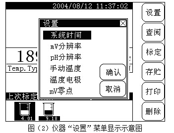 為了保證更好地使用本儀器,在正常使用前,用戶應(yīng)檢查一下系統(tǒng)的設(shè)置情況,包括系統(tǒng)時(shí)間、溫度電極類型、手動(dòng)溫度值等等。在儀器的起始狀態(tài)下,用觸摸按“設(shè)置”鍵,儀器顯示設(shè)置菜單,用戶可以設(shè)置系統(tǒng)時(shí)間、mV分辨率、pH分辨率、手動(dòng)溫度、溫度電極類型以及mV零點(diǎn)等,顯示如圖(2)所示: