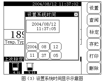 按“設(shè)置”鍵,再按“確認(rèn)”鍵,儀器進(jìn)入設(shè)置系統(tǒng)時(shí)間模塊,用戶可以設(shè)置系統(tǒng)時(shí)間,窗口上方為當(dāng)前的系統(tǒng)時(shí)間,下方為對(duì)應(yīng)的時(shí)間按鍵,包括“年”、“月”、“日”、“時(shí)”、“分”、“秒”鍵,顯示如圖(3)所示: