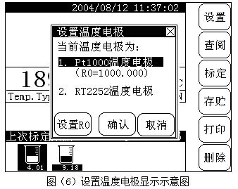 本儀器允許連接二種溫度電極,即Pt1000溫度電極(T-820D或T-820C型溫度傳感器)或者本廠生產(chǎn)的RT2252溫度電極(T-818-B-6型溫度傳感器),用戶必須按照儀器連接的溫度傳感器類型設(shè)置相應(yīng)的溫度電極。按“設(shè)置”鍵,選擇“溫度電極”項(xiàng),按“確認(rèn)”鍵,儀器即進(jìn)入溫度電極設(shè)置模塊,顯示如圖(6)所示。