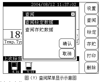 用戶可以查閱上次的標(biāo)定數(shù)據(jù)、標(biāo)液組;查閱存貯的測(cè)量結(jié)果。在儀器的起始狀態(tài),按“查閱”鍵,即可進(jìn)入查閱模塊。顯示如圖(7)所示: