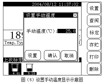 溫度傳感器插口如果連接有溫度傳感器時(shí),儀器自動(dòng)采用溫度傳感器的溫度值,反之,儀器采用用戶設(shè)定的手動(dòng)溫度值作為當(dāng)前的溫度值。按“設(shè)置”鍵,選擇“手動(dòng)溫度”項(xiàng),按“確認(rèn)”鍵,儀器即進(jìn)入手動(dòng)溫度設(shè)置模塊,顯示如圖(5)所示。按“設(shè)置”鍵或者直接在手動(dòng)溫度值顯示區(qū)域按一下,儀器即彈出一個(gè)輸入窗口,用戶可輸入相應(yīng)的手動(dòng)溫度值。設(shè)置完畢,儀器返回起始狀態(tài)。
