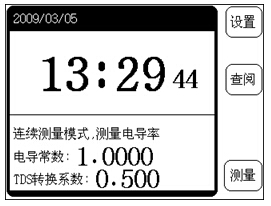 儀器的起始狀態顯示如圖,其中顯示屏左上方顯示有當前的系統時間;下方為當前設置好的測量模式,包括測量參數;右面為“設置”、“查閱”以及“測量”按鍵。右上方的“設置”按鍵,可以設置測量模式、手動溫度、系統設置以及設置電極常數和TDS轉換系數等;中間的“查閱”按鍵,可以查閱電導測量參數、TDS測量參數以及查閱存貯數據;右下方為“測量”按鍵,按此鍵即可開始測量。