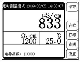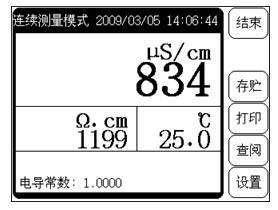 其中顯示屏上方顯示有當前的測量模式、系統時間;測量主窗口顯示當前的電導率以及對應的電阻率和溫度值;顯示屏右面為按鍵,分別為“結束”、“存貯”鍵、“打印”鍵、“查閱”和“設置”鍵等。