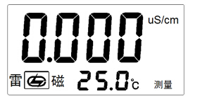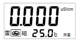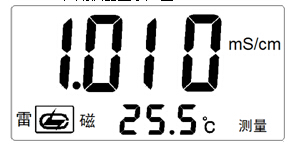 經過上述4.3~4.4的設置,儀器可用來測量被測溶液,按“電導率/TDS”鍵,使儀器進入電導率測量狀態。儀器顯示如圖: