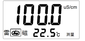如果采用溫度傳感器,儀器接上電導電極、溫度電極,用蒸餾水清洗電極頭部,再用被測溶液清洗一次,將溫度電極、電導電極浸入被測溶液中,用玻璃棒攪拌溶液使溶液均勻,在顯示屏上讀取溶液的電導率值。如溶液溫度為22.5℃,電導率值為100.0uS/cm,則儀器顯示如圖: