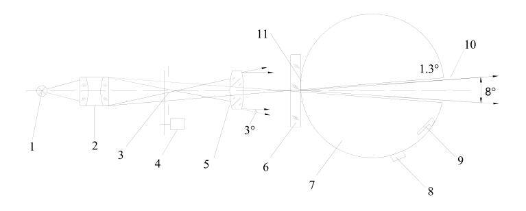 由光源1(鹵鎢燈)發出的光經聚光鏡2會聚,通過光欄3,經遮光式調制器4射到物鏡5 上,物鏡 5 射出一束平行光束,其光線偏離角不大于 3o,并將光欄 3 成像在出射窗 10上,出射窗對入射窗口中心的張角為 8 o,光斑邊緣與出射擊窗形成 1.3 o的環帶。積分球 7 內裝有一可擺動的標準反射器 9,當測定透光率及總透射光時,標準反射器被控在位,擋住出射窗;當測散射光時,從出窗處讓開。