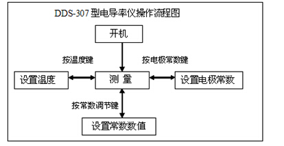 在測量狀態下,按“溫度”鍵設置當前的溫度值;按“電極常數”和“常數調節”鍵進行電極常數的設置,簡要的操作流程見下圖: