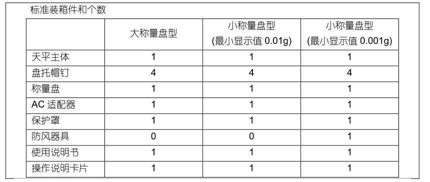 請打開包裝箱,取出天平和附件。請根據天平的機種確認以下的標準裝箱件齊全、無破損。