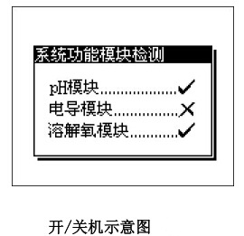 b.平時關(guān)機(jī)狀態(tài)下,按一下儀器的“開/關(guān)/背光”鍵打開電源開關(guān)。儀器開機(jī)后,顯示儀器名稱,并自動檢測本儀器支持的測量模塊,顯示如圖,稍等片刻,儀器進(jìn)入起始狀態(tài),用戶即可開始使用儀器。