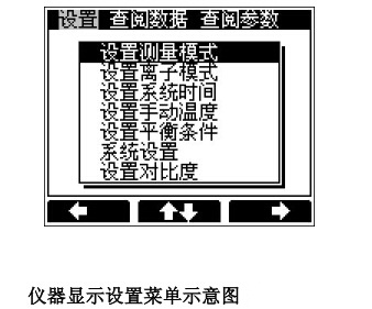 本設(shè)置功能可以設(shè)置“測量模式”、“離子模式”、“系統(tǒng)時間”、“手動溫度”、“平衡條件”、“系統(tǒng)設(shè)置”、以及“對比度”等。在儀器的起始狀態(tài)下,按“開始”鍵,儀器顯示設(shè)置菜單,顯示如圖:
