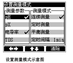 “設(shè)置測量模式”:設(shè)置當(dāng)前的測量模式(連續(xù)測量模式、定時測量模式、平衡測量模式或者離子濃度測量模式)以及需要測量的測量參數(shù);“設(shè)置離子模式”:用戶更換當(dāng)前的離子模式,比如從測量 Cl-改變?yōu)闇y量 F-;