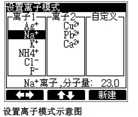 按“自定義”鍵,并選擇“新鍵離子模式”、“修改離子模式”或者“刪除離子模式”等即可由用戶自己管理自定義離子模式。用戶必須選擇正確的離子模式后才能開始濃度測量,如果選用了不同的離子模式,那么將導(dǎo)致最后的結(jié)果的不正確。比如用戶需要測量鈉離子濃度,則首先應(yīng)該由“設(shè)置離子模式”功能模塊中選擇“Na+離子模式”,然后才可以開始鈉離子的濃度測量,其他依此類推。