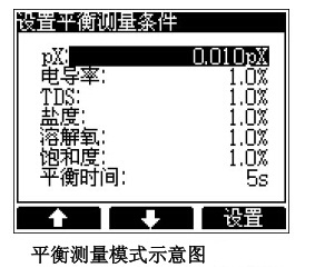 平衡測量條件對應(yīng)儀器的平衡測量模式,設(shè)置各測量參數(shù)的平衡條件,圖示 pX 的平衡條件即為 0.010pX,當(dāng) pX(包括 pH)測量值的變化量小于 0.010pX 范圍時即認(rèn)為本次測量有效。