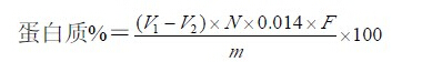 用0.05mol/LHCL 滴定接收瓶內的溶液,滴定至(暗)灰色時為止,記下消耗HCL 的毫升數,按下列式子計算蛋白含量: