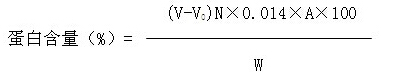 用0.1N HCl滴定接收瓶內的溶液,滴定溶液由綠色變成淡紫色時為止,記下消耗HCl的毫升數,按下式計算蛋白含量: