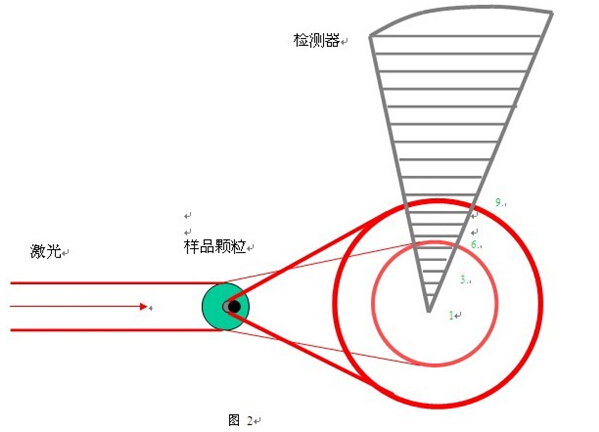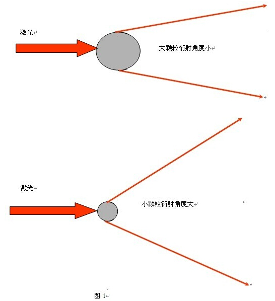 激光粒度儀是基于光衍射現(xiàn)象而設(shè)計(jì)的,當(dāng)顆粒通過(guò)激光光束時(shí),顆粒表面會(huì)衍射光,而衍射光的角度與顆粒的粒徑成反向的變化關(guān)系,即大顆粒衍射光的角度小,小顆粒衍射光的角度大,如圖 1 所示。