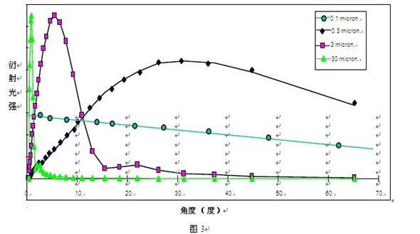 然后再通過(guò)該位置的檢測(cè)器所接收到的衍射光的強(qiáng)度,得到所對(duì)應(yīng)粒徑顆粒的百分比含量。但是,顆粒衍射光的強(qiáng)度對(duì)角度的依賴性是隨著顆粒粒徑的變小而降低,如圖 3 所示。當(dāng)顆粒小到幾百納米時(shí),其衍射光強(qiáng)對(duì)于角度幾乎完全失去依賴性,即此時(shí)的衍射光會(huì)分布在很寬的角度范圍內(nèi),而且單位面積上的光強(qiáng)很弱,這無(wú)疑增加了檢測(cè)的難度。