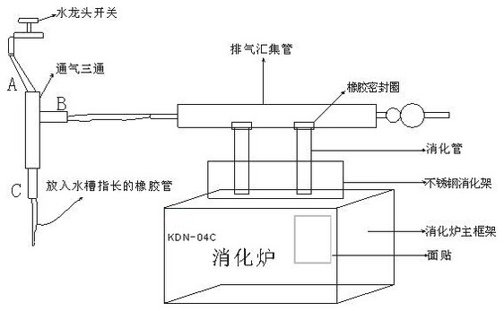 抽吸泵A端用橡皮管同水龍頭連接,B端接橡皮管與排污管排氣口彎管處連接,C端接橡皮管置入下水道,B、C端連接橡皮管不宜過長,消化排污時自來水量應盡量開大,增大抽吸泵的吸力,使廢氣與自來水一起從下水道中排出。