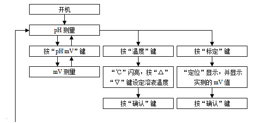 c)按“溫度”鍵,使儀器進(jìn)入溶液溫度狀態(tài)(此時(shí)℃溫度單位指示燈閃亮),按“△”鍵或“▽”鍵調(diào)節(jié)溫度顯示數(shù)值上升或下降,使溫度顯示值和被測(cè)溶液溫度值一致,然后按“確認(rèn)”鍵,儀器確定溶液溫度后回到pH測(cè)量狀態(tài)。