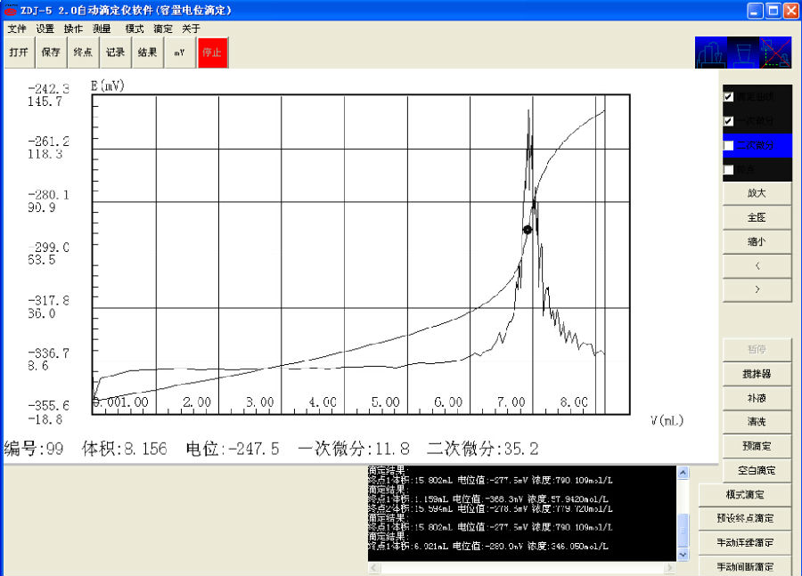 準確稱取雙甘膦0.18g(精確至0.0002g)于50ml滴定杯中,放入攪拌珠,加入三乙醇胺5ml,緩沖溶液20ml。儀器自動判別滴定終點,顯示測試結果。