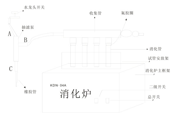1.將裝有樣品的消化管安放在試管安放架上,裝上氟膠圈和收集管,一起安放在消化爐主機上面。(如上圖所示)