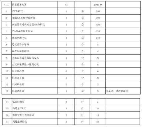 主要儀器設備包括分析儀、測序儀、離心機、冷凍機、研磨機、光度計、儲藏箱、PCR儀等,具體項目如下表所示: