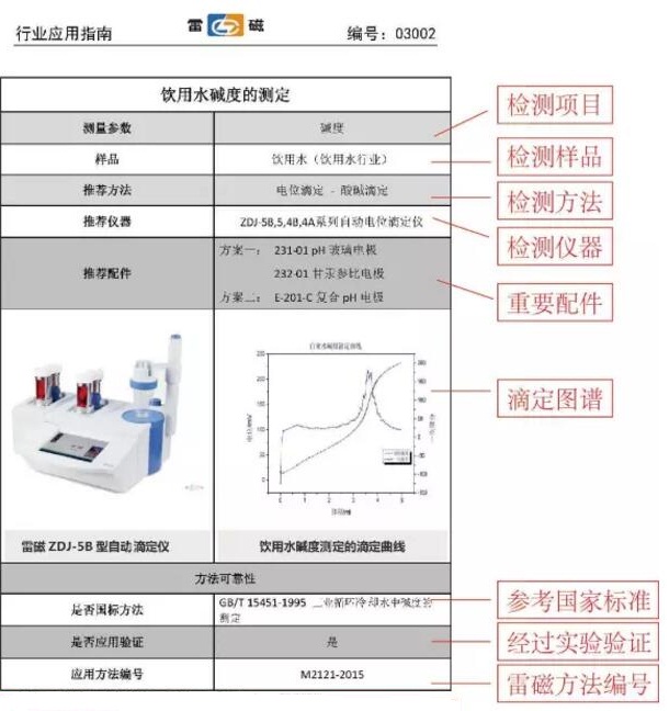 《行業應用指南》針對不同行業的分析測試需求,以簡易的表格形式列出完成該檢測項目所需的關鍵信息。包括:行業信息、測試項目、樣品名稱、測試方法、主要儀器設備、關鍵配件、測試圖譜(如有)、測試方法依據、以及雷磁《應用方法》文件信息。