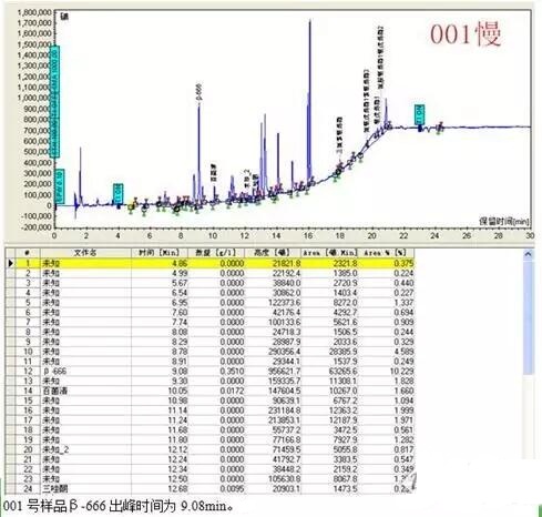 ①樣品001號β-666有檢出,我們用兩個程序升溫來判斷,將程序升溫變慢后,仍有β-666檢出。