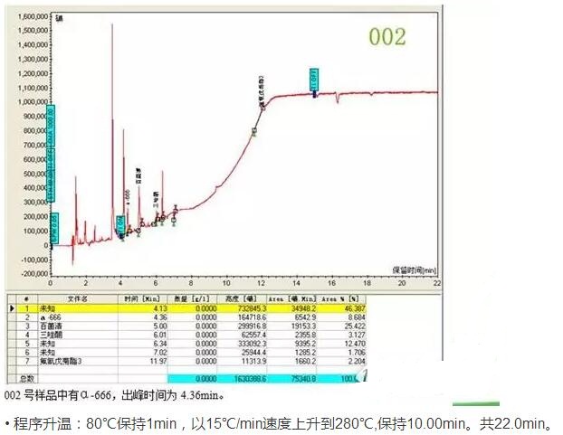 ②樣品002號有α-666檢出,用兩個程序升溫來判斷,將程序升溫變慢后,α-666未檢出。