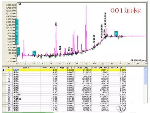 用改變程序升溫的方法判斷,001號樣品有β-666,還要用第二種方法再確認,在001號加入β-666,可以看到β-666的峰面積與含量均增加不少,說明是β-666檢出并超過限量值。