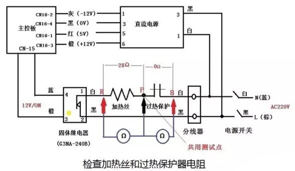 如果加熱電路有電壓,這時候就需要關閉電源,用萬用表的電阻檔,按照圖3所示,分別檢查加熱絲(R,P兩端)和過熱保護器(B,P兩端)的電阻是否為28 歐姆和0 歐姆。一般情況下,最大的原因是加熱絲斷路了,R-P兩端的電阻無限大。