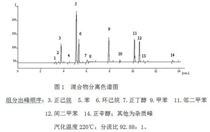 甲苯對苯的相對定量校正因子:190℃時,1.0955;220℃,1.1392;250℃,1.0949