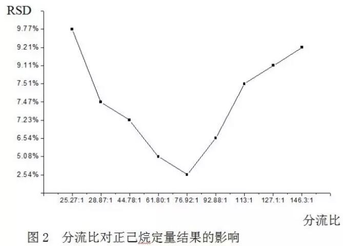 ①分流比過低(<1/30)或過高(>1/120)時,分流歧視加劇,低沸點組分正己烷的正誤差、較高沸點組分甲苯的負誤差急劇增加。當分流比為1/30-1/80時正負誤差都達最小值,此時的分流歧視最小,即有一個最佳分流比在77附近。