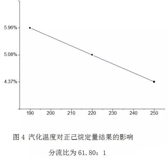 為考察分流比和汽化室溫度對實驗結果的影響,調節分流比,分別為25.27:1 、28.87:1、44.78:1、61.8:1、76.92:1、92.88:1、113:1、127.1:1、146.3:1,實驗結果見圖2和圖3。在分流比為61.8:1時,考察汽化溫度對測定結果的影響,見圖4。