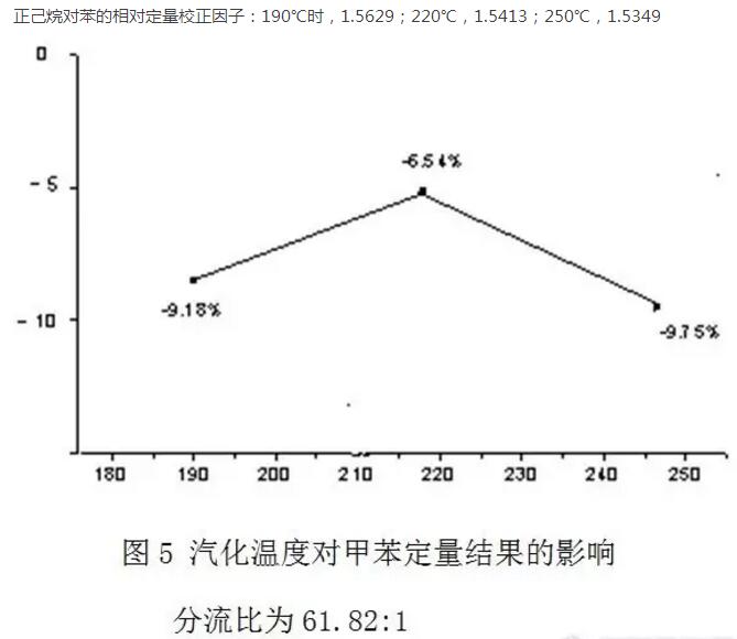 ②進樣溫度的變化對分析結果也有影響。分流比在1/30-1/80范圍內,如61.80:1時,隨著進樣口溫度的升高(190-250℃),低沸點組分正己烷正誤差減小,較高沸點組分甲苯的負誤差減小后增加。所以,本實驗選擇的汽化溫度為220℃。