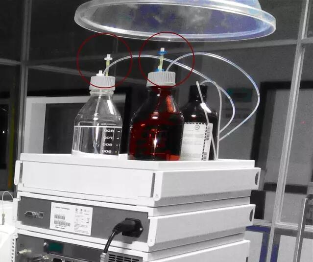 液相溶劑瓶原裝蓋上有兩個小孔,如果擔心空氣當中的懸浮顆粒會落入瓶中,污染流動相,為了避免污染,又防止出現內外壓差,對溶劑瓶做了如下小改進: